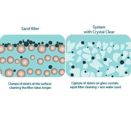 Благодаря своим натуральным абсорбционным возможностям Crystal Clear позволяет обеспечить «объемную фильтрацию» (по сравнению с «поверхностной» фильтрацией у песчаных фильтрующих элементов). В ходе промывки фильтра частицы загрязнения отмываются гораздо легче от стекла, чем от песка, что также позволяет сократить время промывки.